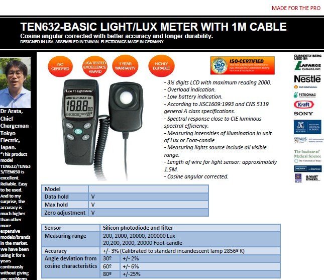 You are here: Home Products Light/Lux meters TEN632-Economical Lux meter with 1m cord connection cable